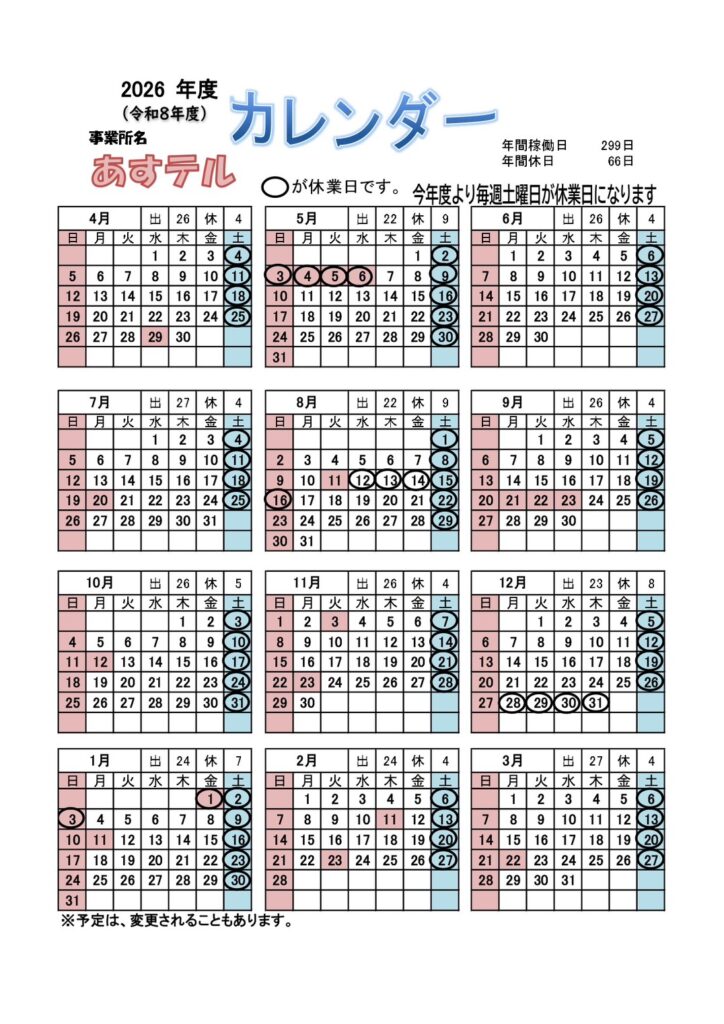 2026年度 あすテルカレンダー